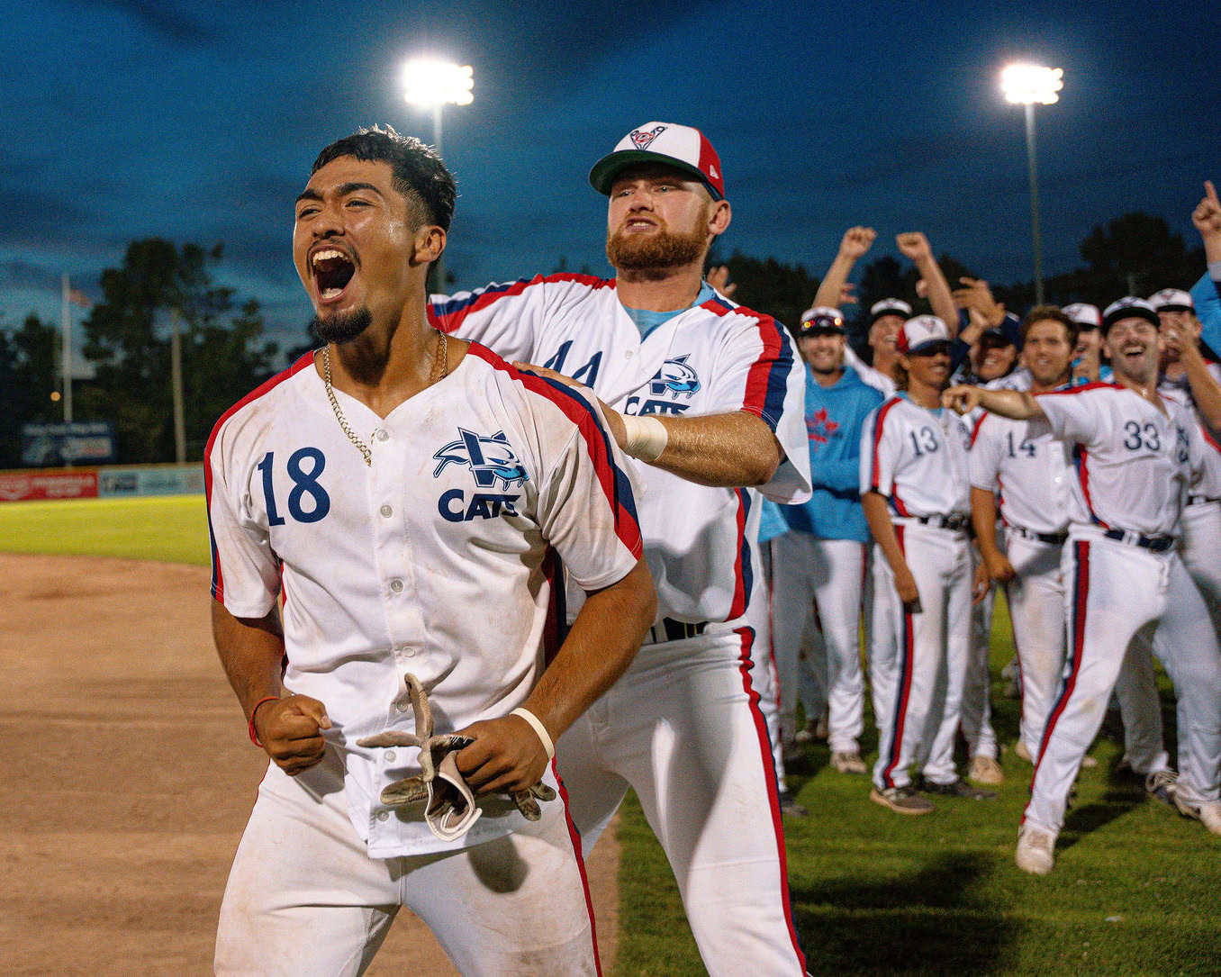 Dillon Lopez salutes the crowd after his walk-off base hit gave the Cats a dramatic 10-9 win over the Kelowna Falcons last July 12th (Photo: Justin Morash).